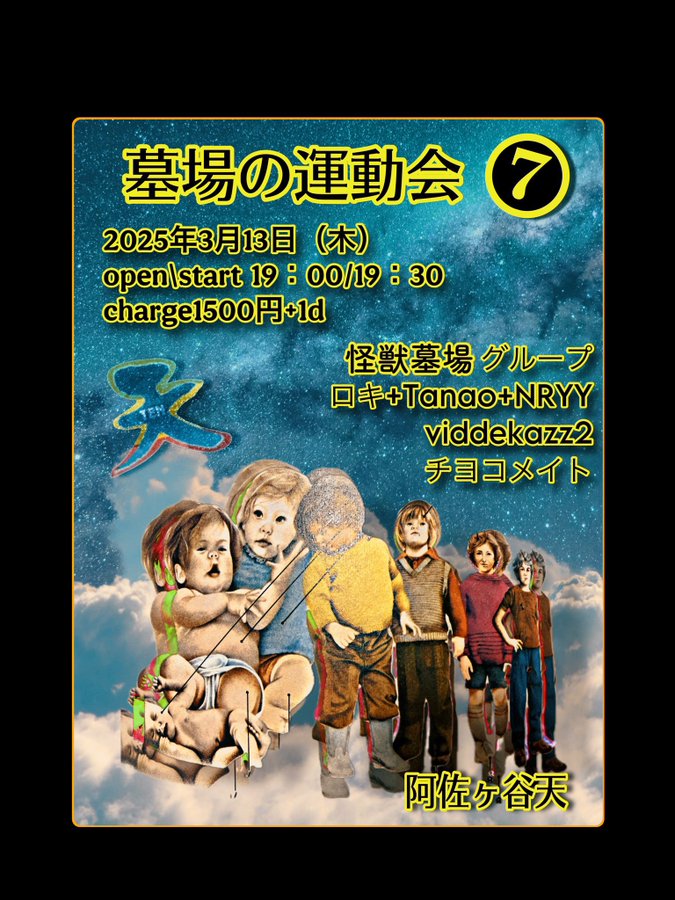 | 2025.03.13 sun | 阿佐ヶ谷天 2025年3月13日(木) 開場19:00 開演19:30 木戸銭1500円(1d) 19 : 30 ~ 20:00 怪獣墓場グループ 20 : 10~ 20 : 40 ロキ+Tanao+NRYY 20:50~21:20 チヨコメイト 21:30〜21:50 viddekazz2 >>ライブ映像はこちら